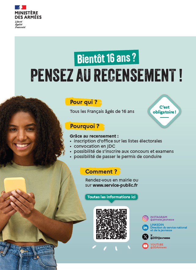 Les jeunes qui viennent de fêter leurs 16 ans doivent obligatoirement se présenter en mairie dans les 3 mois qui suivent pour se faire recenser pour ne pas être pénaliser ensuite.